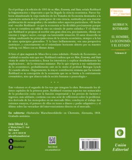 El presente volumen – en su tercera edición – es el tercero de los tres que integran la obra El hombre, la economía y El Estado. Con Poder y mercado, Unión Editorial concluye la presentación en español de uno de los proyectos más ambiciosos y sugerentes de Murray N. Rothbard, cuyas primera y segunda parte fueron publicadas en 2011 y 2013 respectivamente. Los tres volúmenes, en conjunto, conforman un imprescindible tratado de economía que abarca todo aquello que podemos denominar acción humana o praxeología.